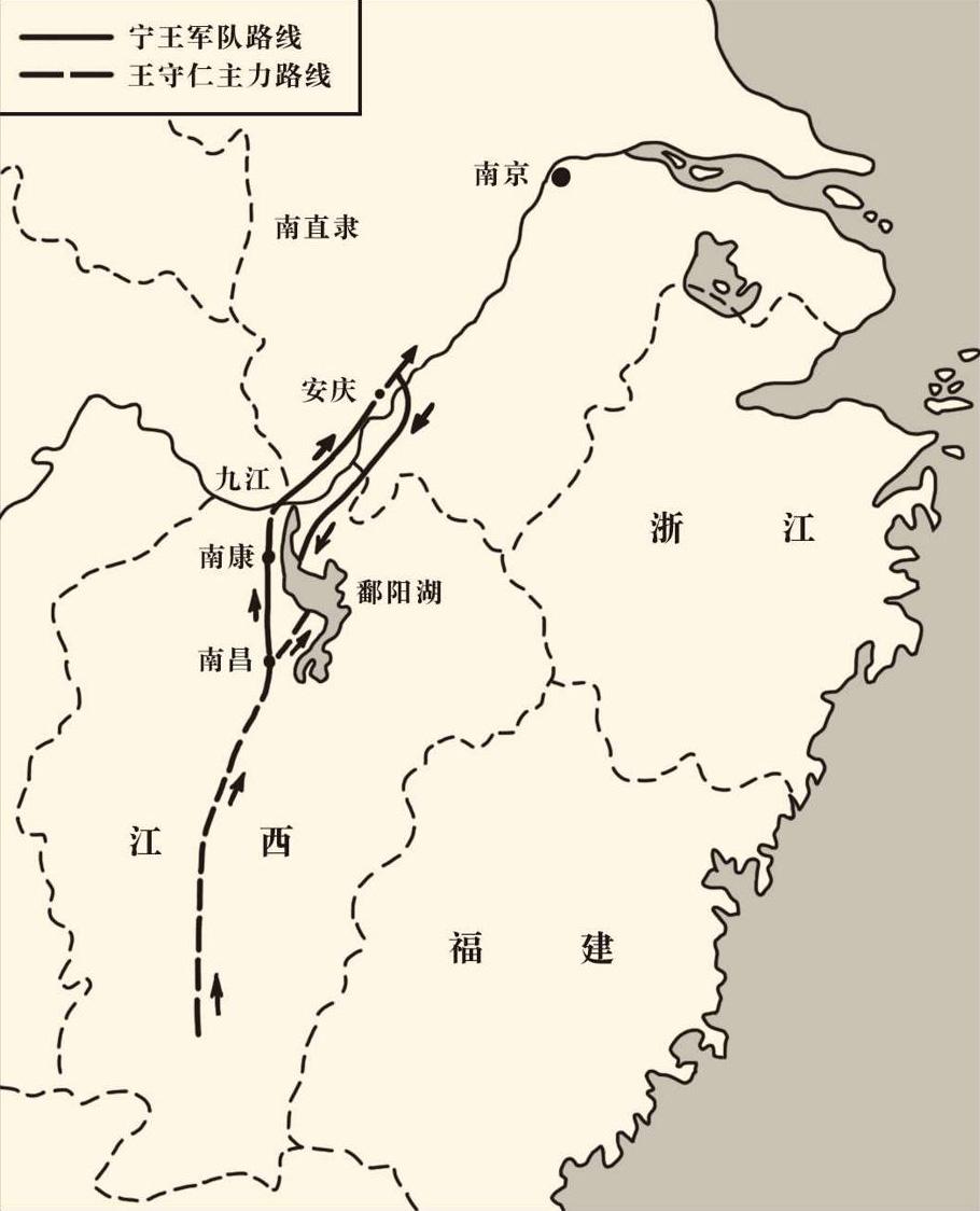 那位“威武大将军镇国公朱寿”却觉得不好玩,佞臣们更是羡慕嫉妒恨。江彬和太监张忠甚至要求王守仁把宁王送到鄱阳湖放了,以便皇帝在模拟战中将其擒获。这个馊主意理所当然地被拒绝,王守仁也只好押解宁王去南京。(见《纪事本末》卷四十七,《明史·张忠传》称此事系张忠所谋。)
